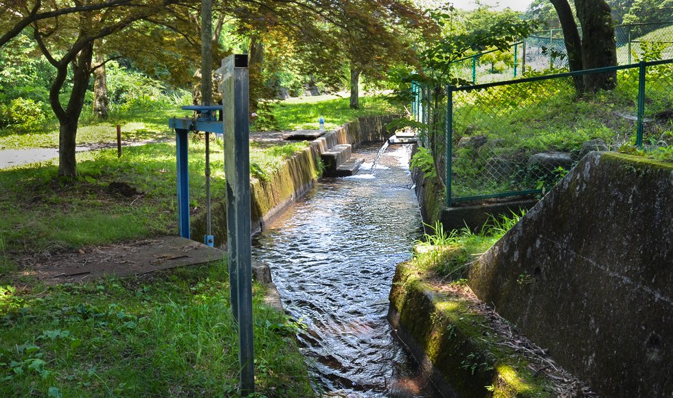 ワンワンと湧き出る水が農業用水となって田んぼに向かって流れていきます