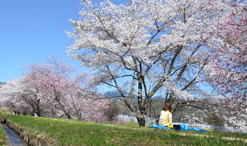 長野県茅野市の桜の名所、音無川沿いの桜並木で、お弁当を持ってお花見です。
